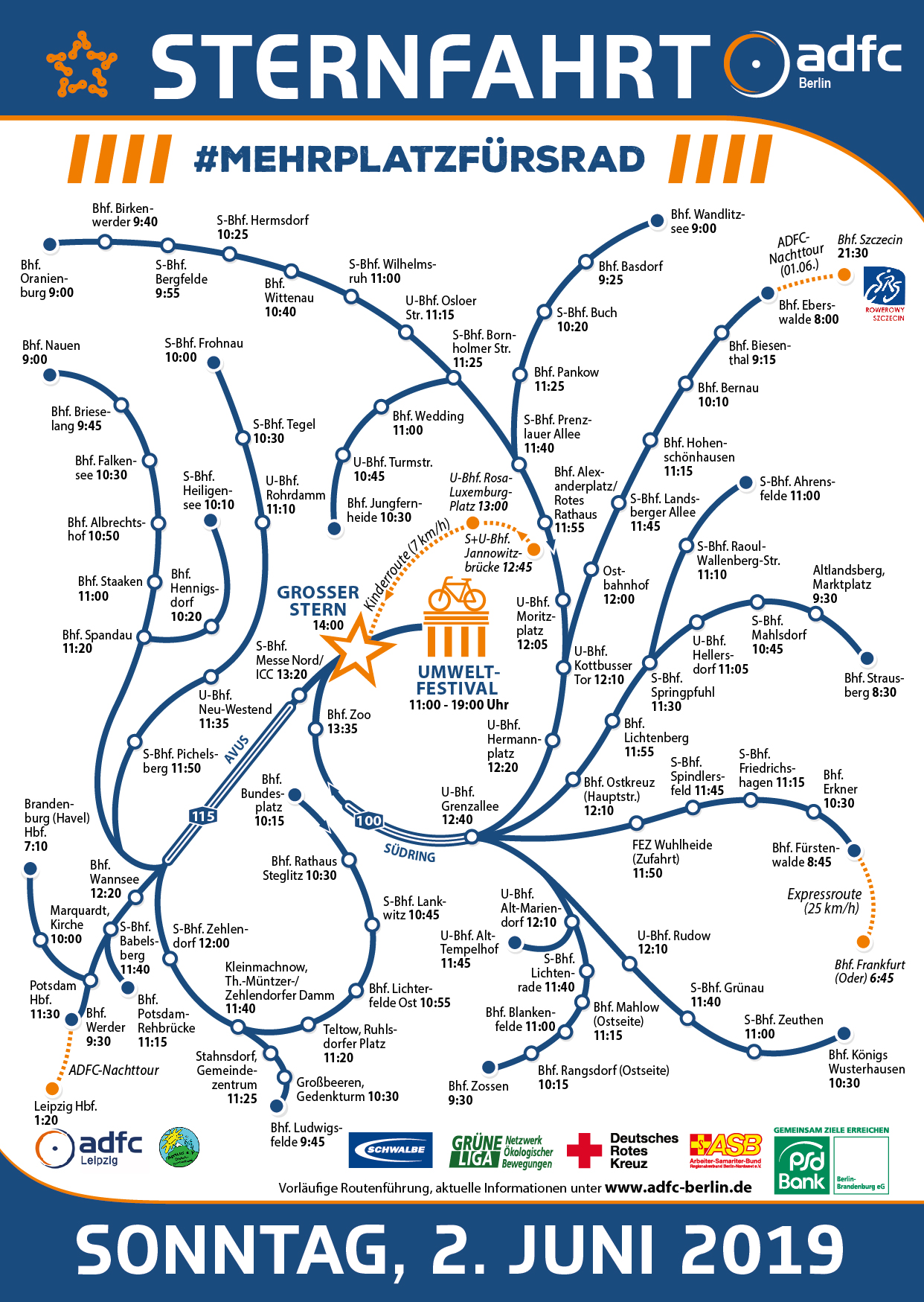 Am kommenden Sonntag soll das Wetter sehr schön werden (bis 27 Grad, nur leichte Bewölkung): Ideale Bedingungen zum entspannten Radeln im Rahmen der ADFC-Sternfahrt 2019. Ich werde ab Bhf. Oranienburg um 09:00 Uhr losfahren, wir können uns dort treffen oder ihr stoßt zu einem der späteren Routenpunkte zu späterer Uhrzeit (siehe Anhang) hinzu. Zum Ausklang können wir über das Festival auf der Straße des 17. Juni schlendern oder einen der nahegelegenen Biergärten im Tiergarten aufsuchen.